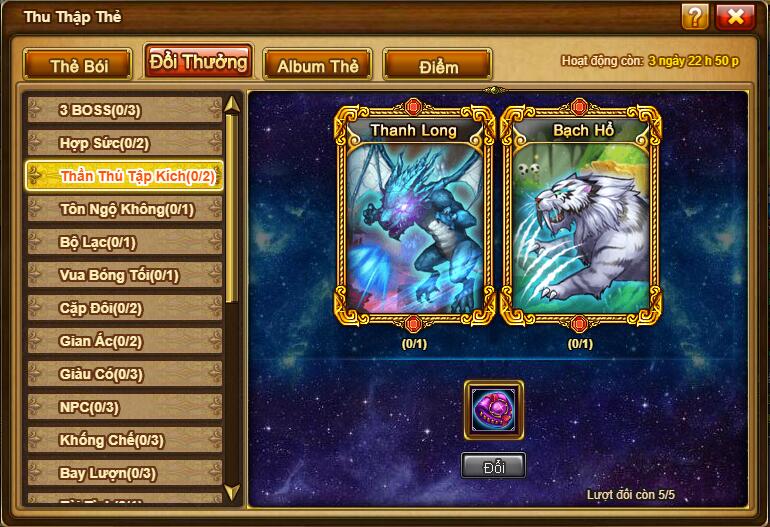 Hình trên là giao diện đổi thưởng của Thu Thập Thẻ bài, các bạn nhấp từng hàng bên trái để xem chi tiết phần thưởng từng mục nhé, đừng quên là số lần đổi tối đa của mỗi hàng là bao nhiêu, vì nó rất quan trọng(Số lần tối đa sẽ hiện thị góc dưới bên phải).